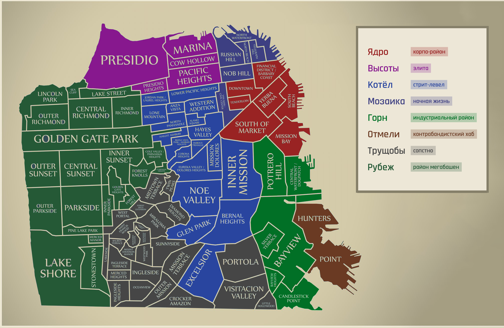 Объёдинённые районы Котла: The Mission (Мишн), Chinatown (Чайна-таун), Hayes Valley (Хейс-Вэлли), The Castro (Кастро), Excelsior (Эксельсиор).